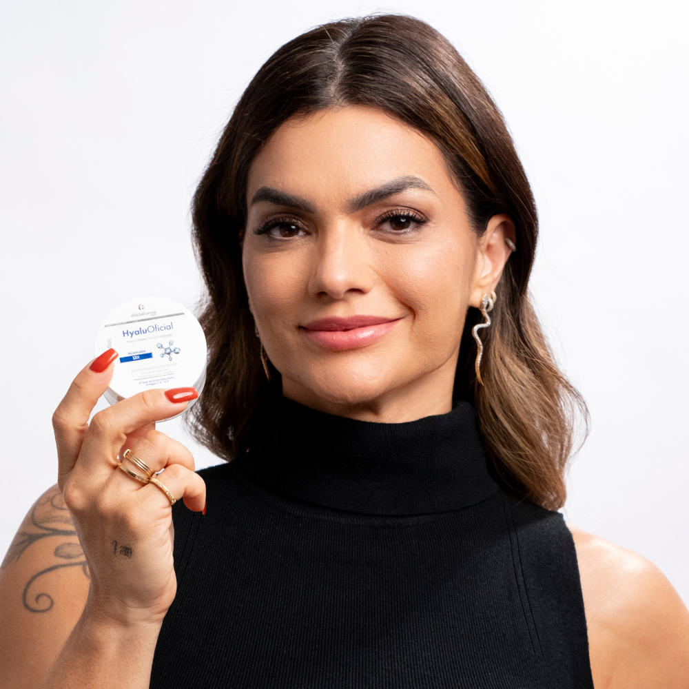 O HyaluOficial Preenchedor Anti-Idade 12X é formulado com o Ácido Hialurônico em cascata e os Ômegas 3, 6, 7 e 9 para estimular a produção de colágeno e reparar profundamente as tramas de sustentação da pele.
